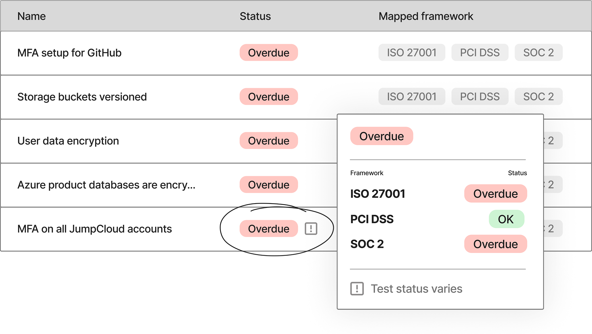 During audits, customers had to manually reconcile outcomes — explaining why a failing test didn’t apply to PCI or interpreting results differently depending on the framework. That context lived in their heads, not the product.